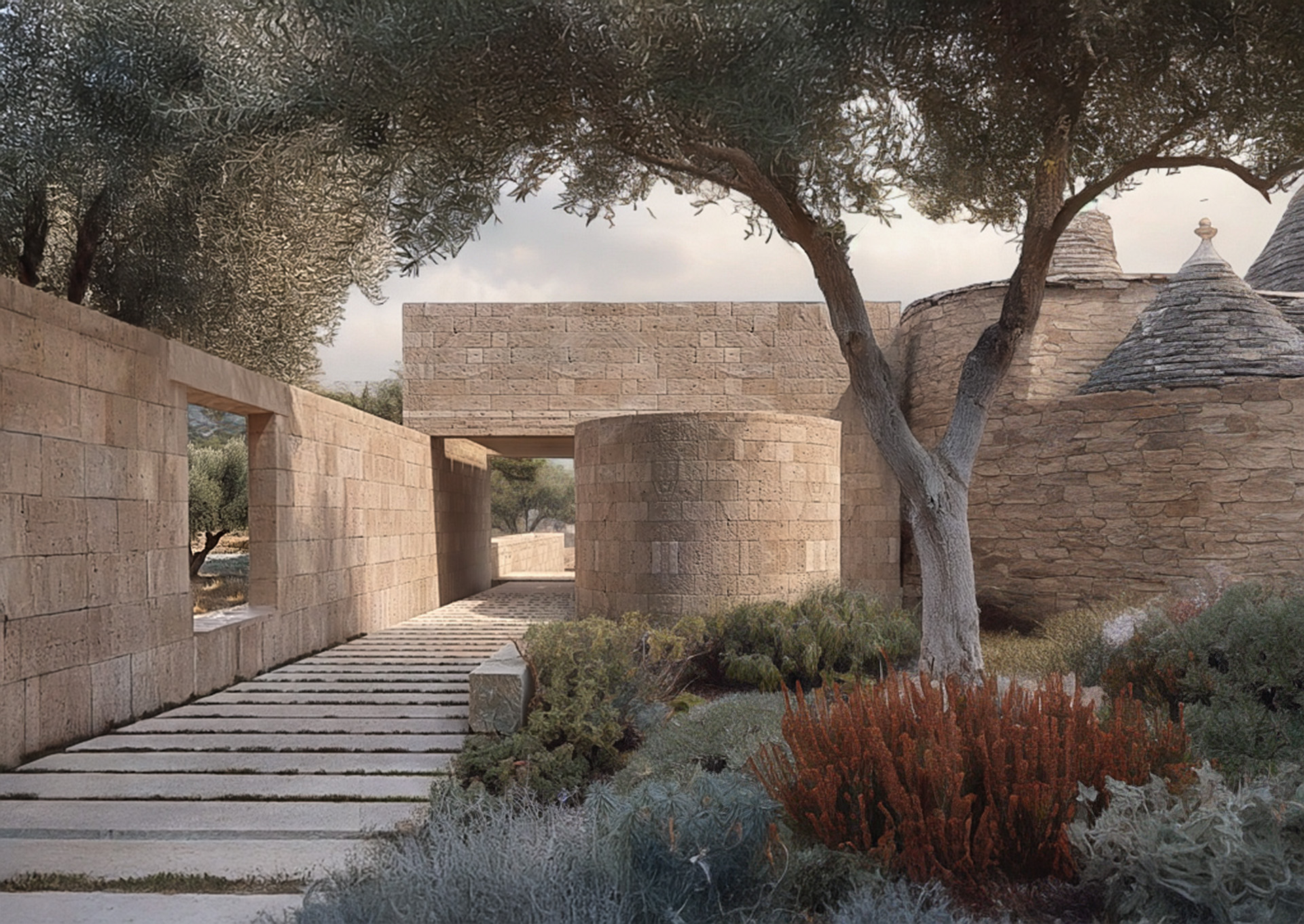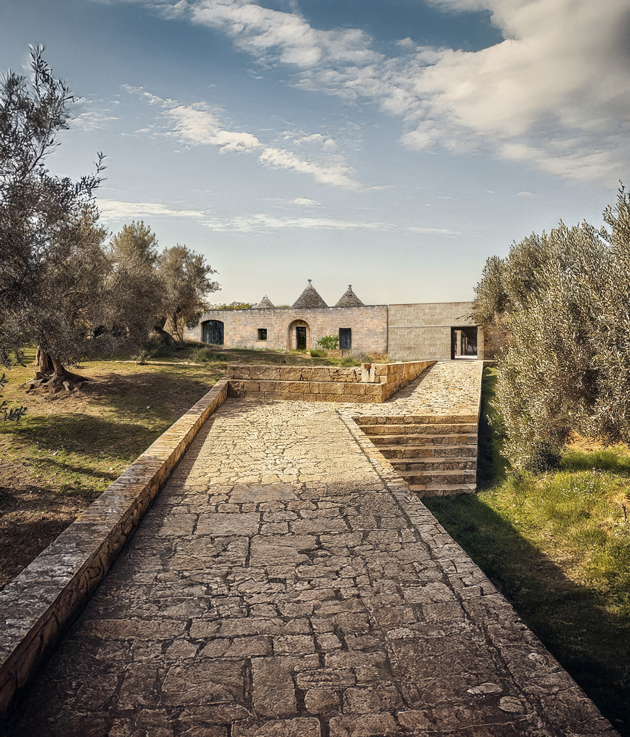 The project is set in a valley of olive groves dotted with rural properties, where the existing structure is the ruin of a trullo, a typical Apulian typology. The project aims to restore and extend the trullo while introducing a new house that, together with the trullo, forms a central courtyard.