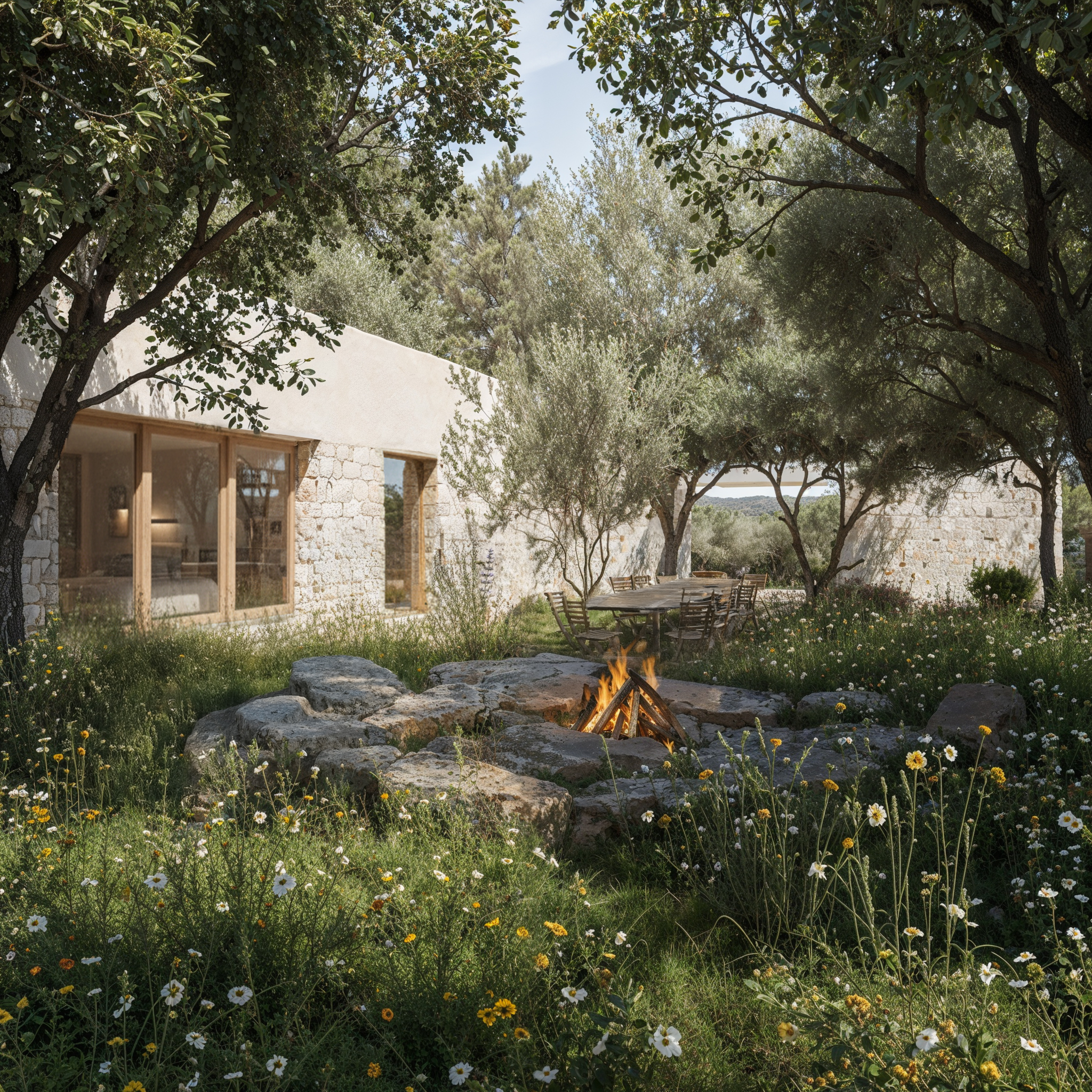 Its covered passage signals the entrance to the courtyard. Its layout draws inspiration from the jazzo, a traditional Apulian walled farmstead organized around a central courtyard, reinterpreted here as an inhabited garden, where a shared table, seating areas, and Mediterranean shrubs enrich the biodiversity of the surrounding olive grove. Completing the ensemble, the new L-shaped house of stone and hempcrete unfolds along the slope. Covered by a vaulted roof, its interior adapts to the topograpghy through a sequence of stepped levels, each defining a different function (kitchen, dining, living, bedroom) while remaining part of a continuous open space.